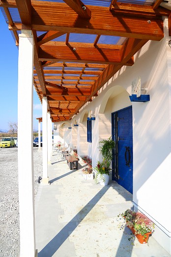 また、入り口の大きな扉は、手作業で杉の板を青く塗装しました。