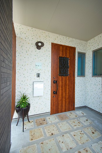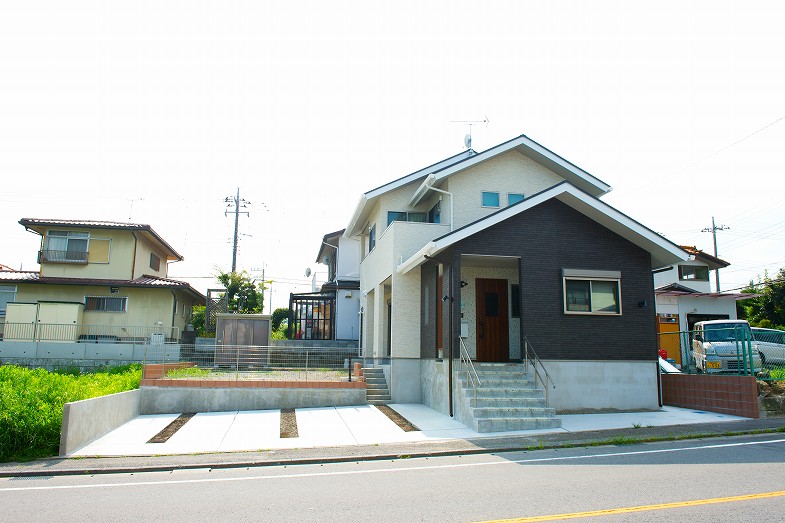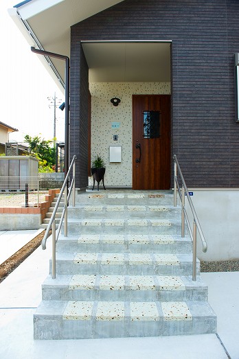 外階段、玄関前に大谷石を用いて外観から自然素材感を出しました。