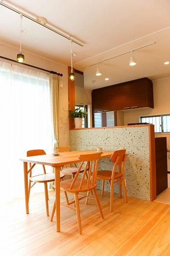 また、キッチンカウンターの壁にも大谷石を用いることで壁や床の自然素材との風合いを強調しました。
