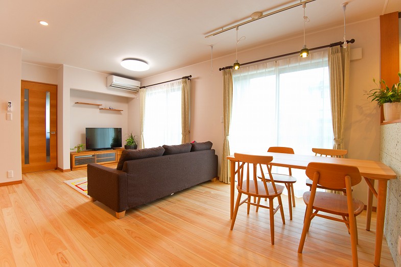 高低差のある土地形状を活かし、南側にリビング等の生活スペースを配置することで、南側からの光を充分に取り込み、家全体に広がる心地よい自然素材の雰囲気をさらに演出します。